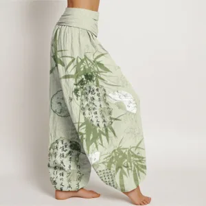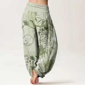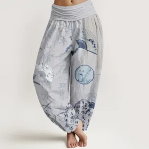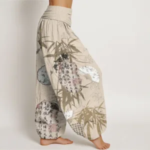 - Design: The harem pants feature a blend of traditional Asian motifs. including delicate fan illustrations. bamboo details. and elegant calligraphy. The intricate patterns flow seamlessly across the fabric. creating a harmonious and artistic design. The overall look is both serene and sophisticated. making these pants a unique and stylish addition to any wardrobe.