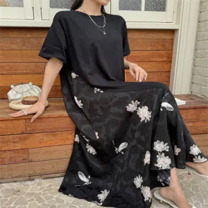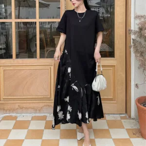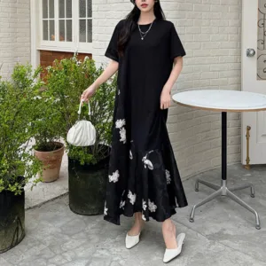 Casual Flower Jacquard Cotton midi dress offers a relaxed fit with a simple design. This black dress features intricate white floral embroidery on the lower body. adding a touch of elegance while maintaining its understated charm. The short sleeves and loose silhouette make it a comfortable choice for casual outings or leisurely activities.