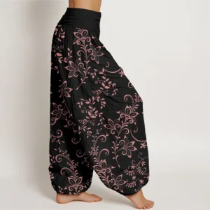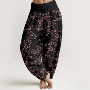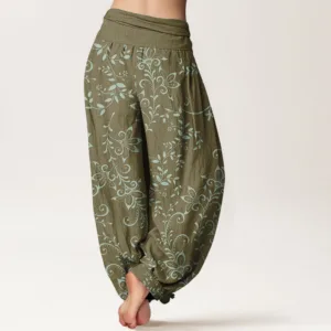 - Design: The harem pants featuring flowers and vine patterns symbolize growth. vitality. and a connection to nature. reflecting the beauty and resilience of floral motifs. This design evokes a sense of harmony and playfulness. making it an ideal choice for those who appreciate a vibrant and organic aesthetic in their wardrobe.