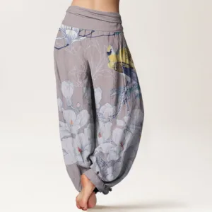 - Design: The harem pants feature Magnolia and Yellow Bird patterns. The yellow bird spreads its wings as if preparing to fly or just landing. The branches are covered with white magnolia flowers. with large. full petals and small red and yellow dots in the center. adding visual contrast. These elements make the pants not only fashionable but also full of meaning.