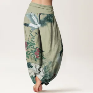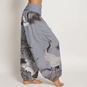 - Design: The harem pants feature Red-crowned Cranes. Pine Trees. and Mountain patterns. The red-crowned cranes are either spreading their wings to fly. or looking for food. or walking leisurely. Each of their feathers is meticulously detailed. the contrast between black and white is sharp. and the touch of vermilion adds a bit of vividness to the picture. The pine trees are tall and lush. and the mountains and bushes create a hazy and peaceful atmosphere. These elements make the pants not only fashionable but also full of meaning.
