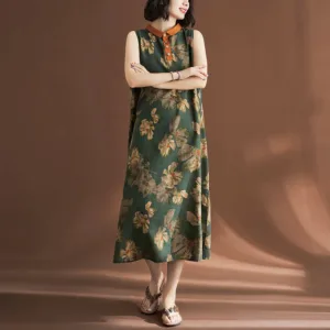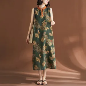 Sleeveless Flower Printed Cotton midi dress features a deep green base adorned with large. randomly placed pale yellow flowers. creating a serene and natural look. The neckline is trimmed with orange fabric and complemented by a row of buttons beneath it. The loose fit of this cotton linen dress offers comfort and ease. making it perfect for relaxed. casual days.