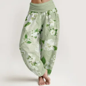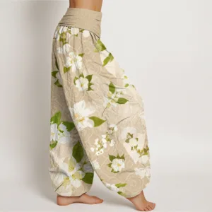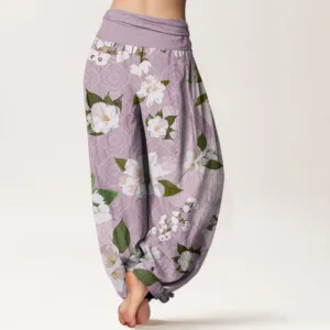 - Design: The harem pants feature a delicate design with large. elegant magnolia flowers and lush green leaves. The intricate floral pattern flows naturally across the fabric. with the soft petals and rich foliage creating a sense of harmony and freshness. This design gives the pants a sophisticated. nature-inspired aesthetic. adding a touch of elegance and calm. The arrangement of the flowers enhances the relaxed. yet refined look of the pants.