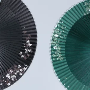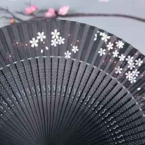 Cherry Blossom Sakura Folding fan showcases a delicate blend of sakura and camellia flowers on silk. supported by a bamboo frame. This 21cm fan embodies grace and renewal. making it perfect for ceremonies or as a decorative piece. Its lightweight design allows for easy use. adding a touch of nature-inspired beauty to any space dedicated to tranquility.