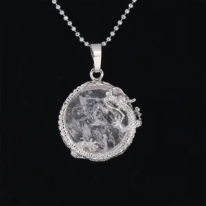 The Chinese Dragon Natural Quartz Crystal Healing Energy Necklace Pendant from Mythstoneis made from high-quality quartz crystal and features a stunning Chinese dragon design. Wear it for its healing energy properties and to showcase your love for Chinese culture. A must-have accessory for any jewelry collection.