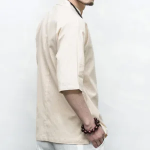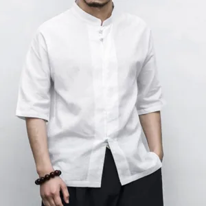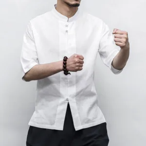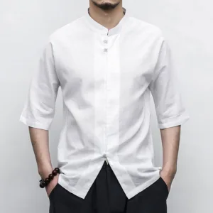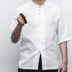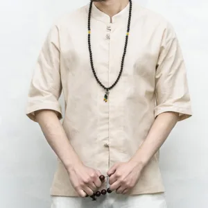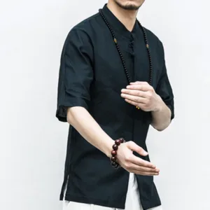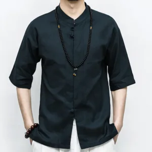 Chinese Frog-Button Tang Suit Zen shirt features a traditional design with half sleeves and classic frog-button closures. Crafted from breathable linen. this men’s shirt offers a relaxed fit and embodies the essence of Zen aesthetics. Perfect for meditation. casual wear. or special occasions. it combines cultural heritage with modern comfort. ideal for those who appreciate traditional Chinese attire.