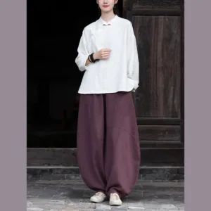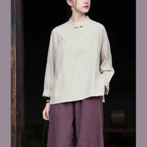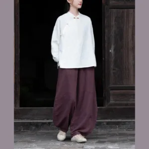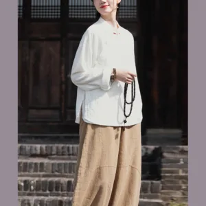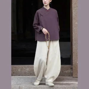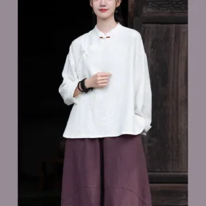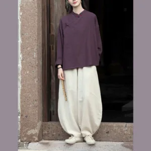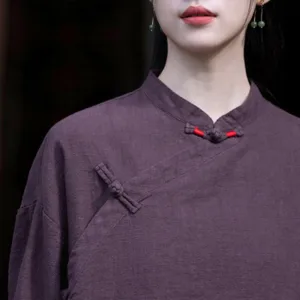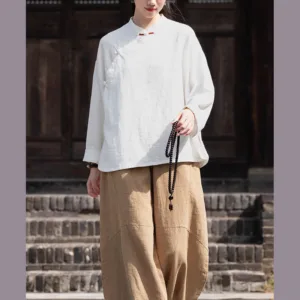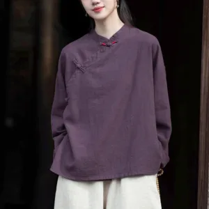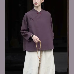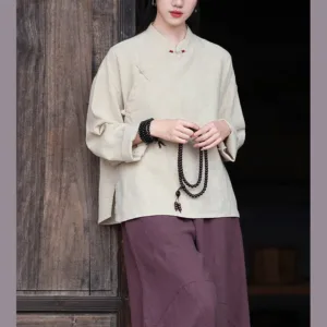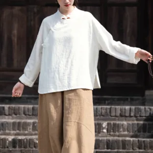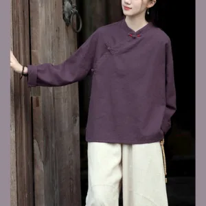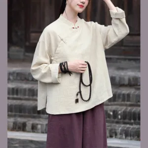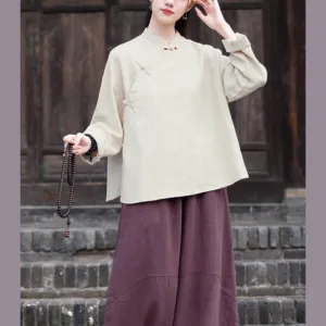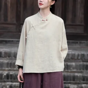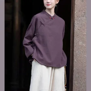 Chinese Hanfu Frog-Button blouse is designed for comfort and tradition. This long sleeve shirt features classic frog buttons and a relaxed fit. perfect for meditation and mindfulness practices. Made from high-quality fabric. it offers breathability and ease of movement. The traditional Hanfu design promotes a calm and centered mindset. making it ideal for both daily wear and cultural activities.
