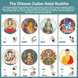 The Chinese Zodiac Natal Buddha refers to the patron saint with the closest magnetic field for each zodiac attribute. Different natal buddhas have different meanings. The natal buddha has a strong spirituality. can prevent disasters and pray for blessings. help the wearer to purify the soul. drive away evil and avoid evil.