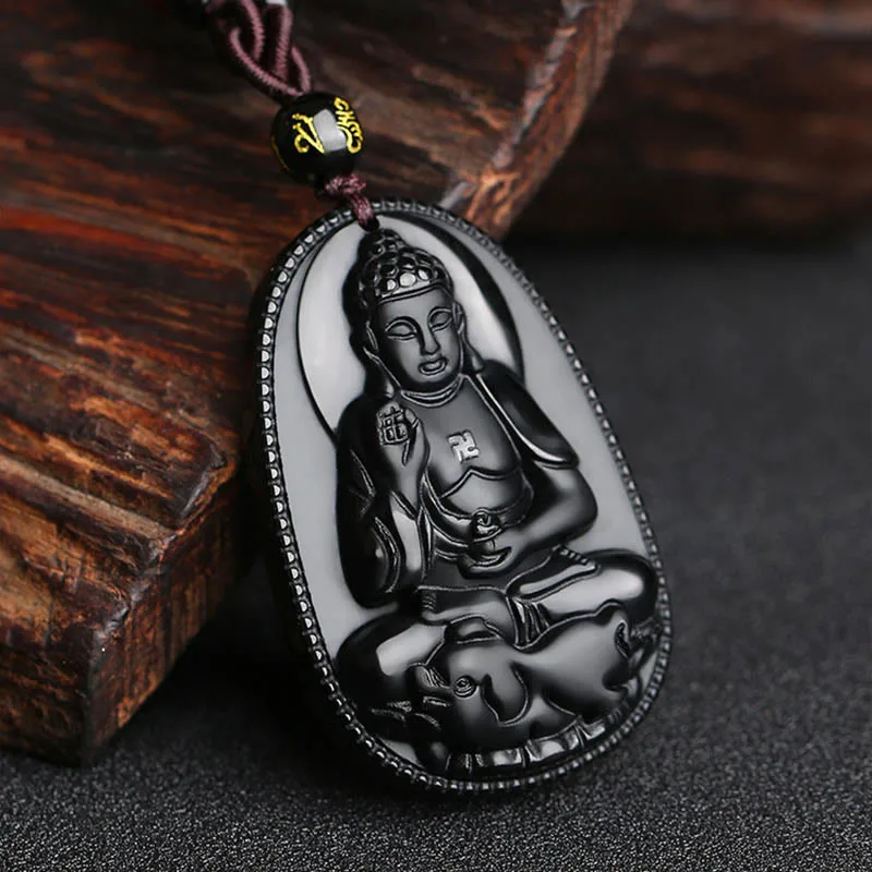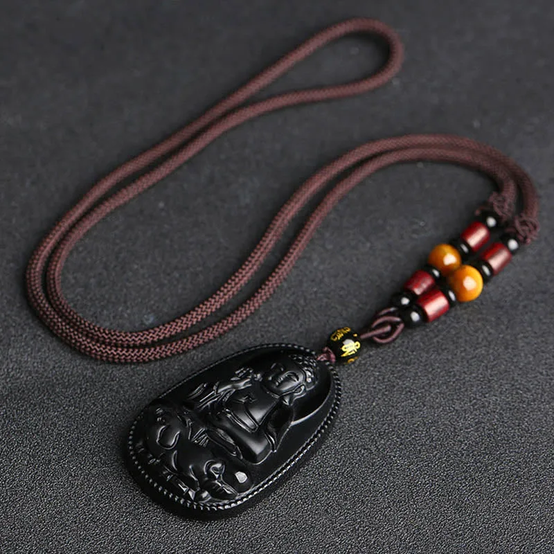 Mythstone Chinese Zodiac Natal Buddha Natural Black Obsidian Purification Necklace Pendant