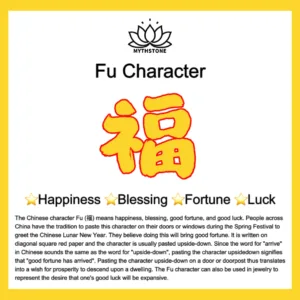 The Chinese character Fu (福) means happiness. blessing. good fortune. and good luck. People across China have the tradition to paste this character on their doors or windows during the Spring Festival to greet the Chinese Lunar New Year. They believe doing this will bring good fortune. It is written on diagonal square red paper and the character is usually pasted upside-down. Since the word for “arrive” in Chinese sounds the same as the word for “upside-down”. pasting the character upside-down signifies that “good fortune has arrived”. Pasting the character upside-down on a door or doorpost thus translates into a wish for prosperity to descend upon a dwelling. The Fu character can also be used in jewelry to represent the desire that one’s good luck will be expansive.