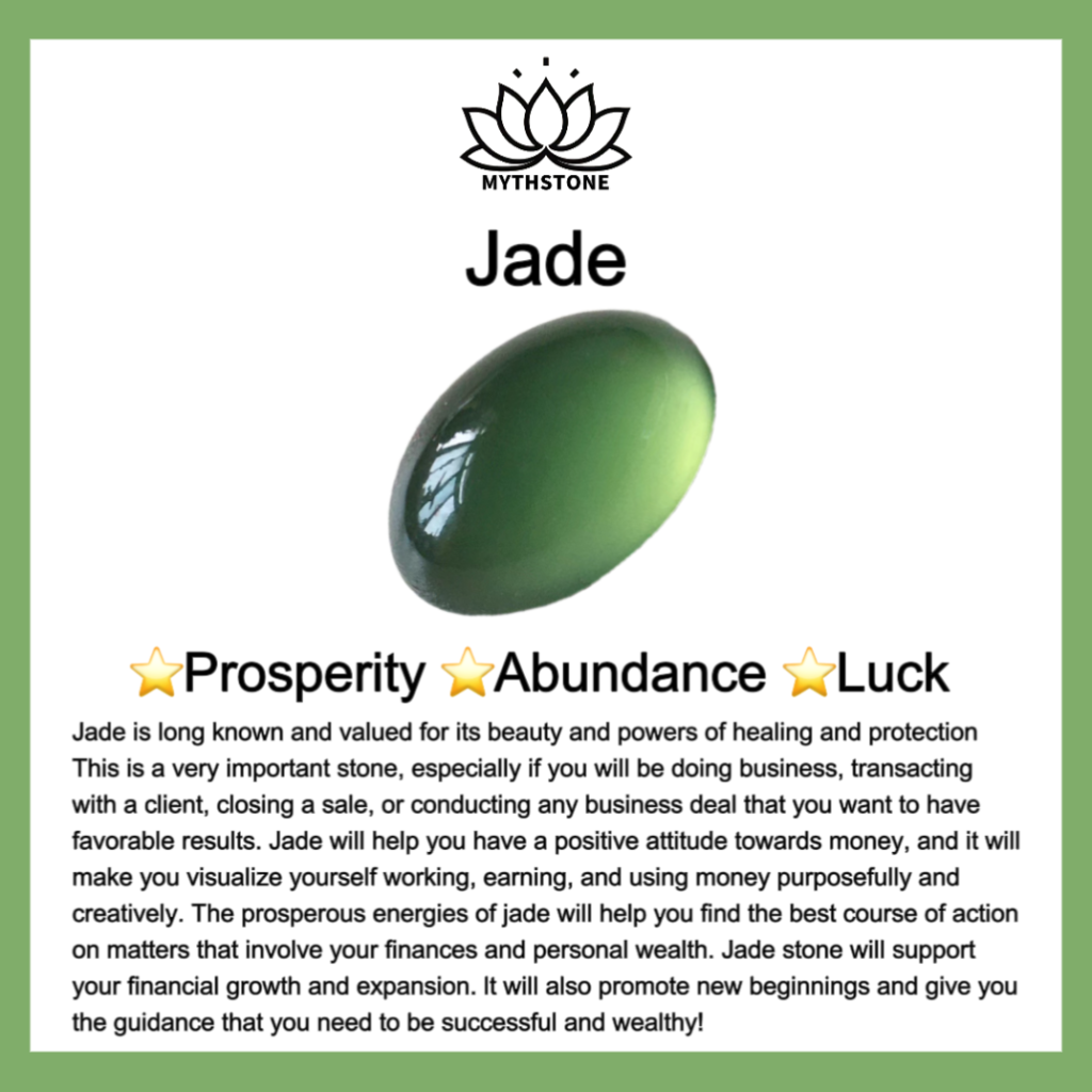 Jade is long known and valued for its beauty and powers of healing and protection. This is a very important stone. especially if you will be doing business. transacting with a client. closing a sale. or conducting any business deal that you want to have favorable results. Jade will help you have a positive attitude towards money. and it will make you visualize yourself working. earning. and using money purposefully and creatively. The prosperous energies of Jade will help you find the best course of action on matters that involve your finances and personal wealth. Jade stone will support your financial growth and expansion. It will also promote new beginnings and give you the guidance that you need to be successful and wealthy!