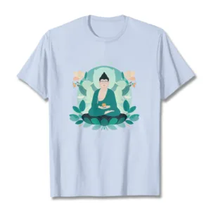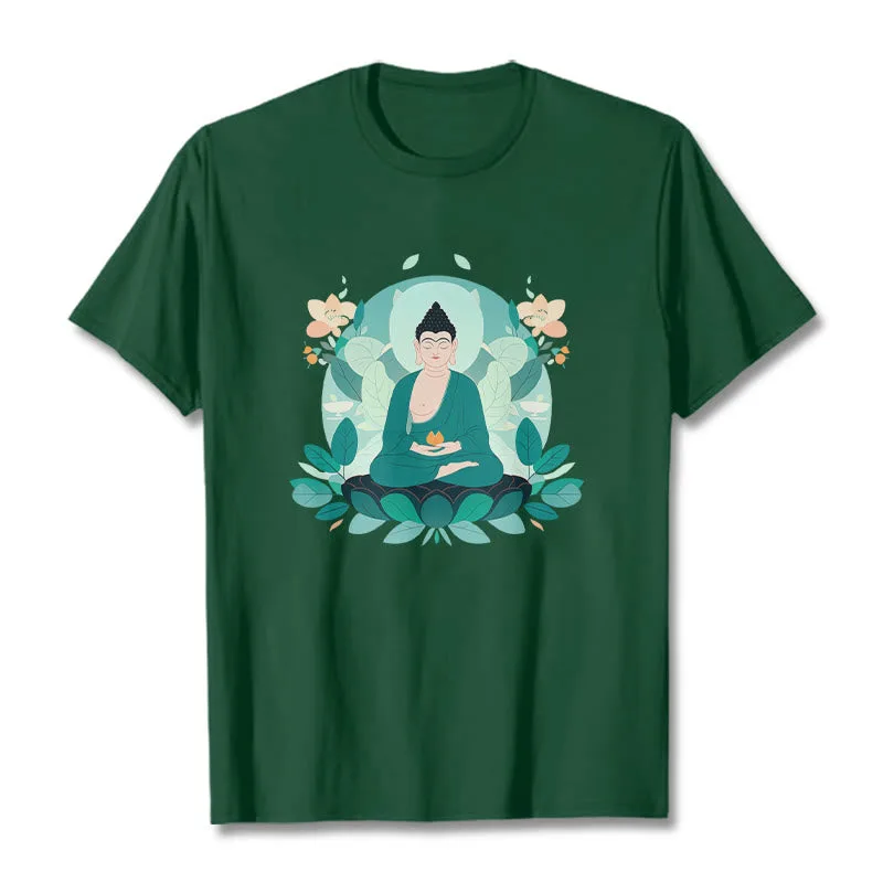 Close Eyes Green Leaf Buddha T-shirtfeatures a serene Buddha with green leaf accents. symbolizing tranquility and growth. Made from comfortable. high-quality fabric. this t-shirt inspires a sense of calm and mindfulness. Perfect for daily wear or meditation sessions. it serves as a reminder to stay grounded and peaceful.
