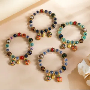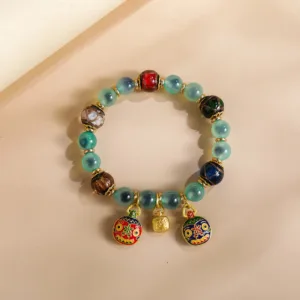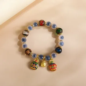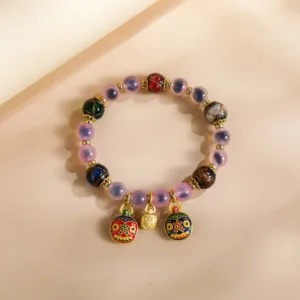 This bracelet. exquisitely crafted by skilled artisans. features colorful candy agate and Mythstone. paired with liuli glass beads. Adorned with the Gold Swallowing Beast Family charm. it’s designed for those who value strength and positivity. making it an ideal accessory for both everyday wear and special occasions.
