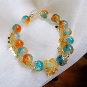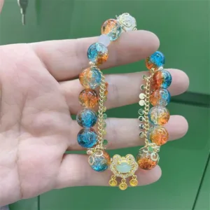 Dive into a rich tapestry of heritage with the Mythstone bracelet. crafted from vibrant Liuli. an age-old Chinese glass. Each bead. hand-molded. showcases the craftsmen’s spontaneous artistry. making every piece unique. Adorned with a Chinese Lock Charm. this bracelet offers more than just elegance; it’s a talisman against harm and a beacon for good fortune. longevity. and esteemed social status. Experience the blend of history. art. and protection.