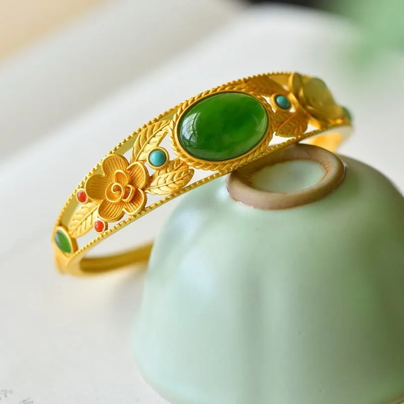Experience the essence of harmony and luck with our Cyan Jade White Jade Flower Leaf Bracelet Bangle from Mythstone. The delicate blend of cyan jade and white jade symbolizes serenity and balance. Adorned with flower and leaf motifs. this bangle serves as a token of luck and positive energy. Wear it to evoke tranquility and attract good fortune into your life’s journey.