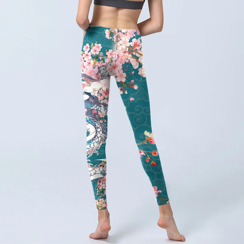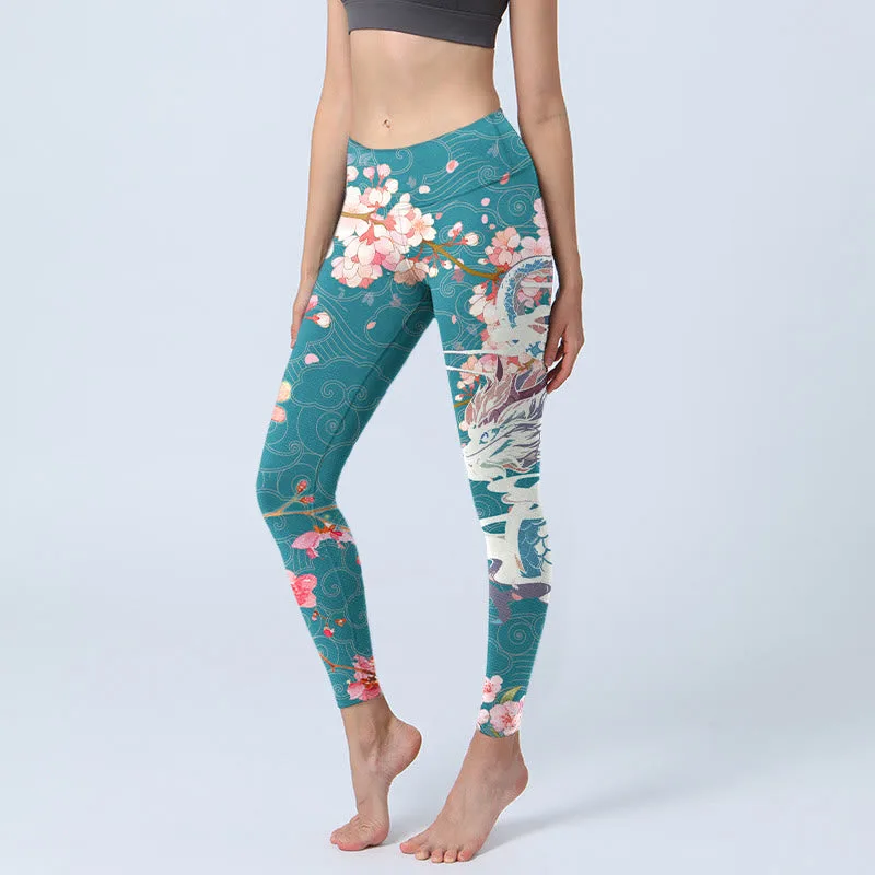 - Design Inspiration: The leggings feature a stunning design with delicate cherry blossoms in soft pink hues. set against a rich teal background. The intricate patterns also include a majestic dragon. adding an element of mysticism and strength to the design. Swirling clouds and flowing lines enhance the fluidity of the composition. blending nature with cultural symbolism. This vibrant and elegant design offers a harmonious fusion of beauty and power.