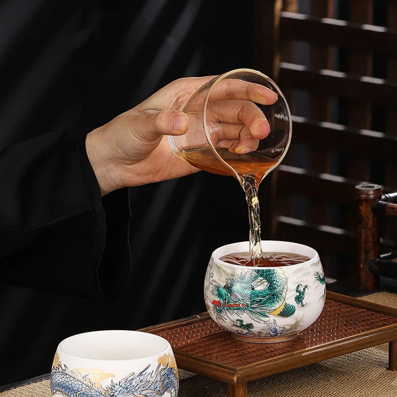 Immerse yourself in the serene world of tea culture with our meticulously crafted Ceramic teacup. Each element. from the dragon to the lotus. is artfully depicted. symbolizing prosperity. longevity. and purity. Designed for Kung Fu tea ceremonies. this 185ml cup is not just a vessel for tea but a medium for mindfulness and a celebration of nature’s tranquility. Its robust construction ensures durability. while the intricate designs invite contemplation. making every tea session a journey of discovery and peace.