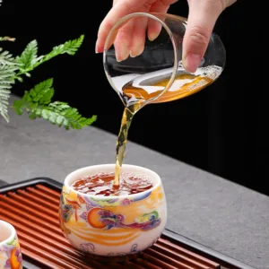 Mythstone’ Sun Ocean Waves Ceramic Teacup is a symphony of spiritual motifs. The intricate design of dragons. phoenixes. clouds. and ocean waves represents harmony and fluidity in life. This teacup is designed for those who seek a reflective and uplifting tea experience. connecting nature’s elements with spiritual introspection.