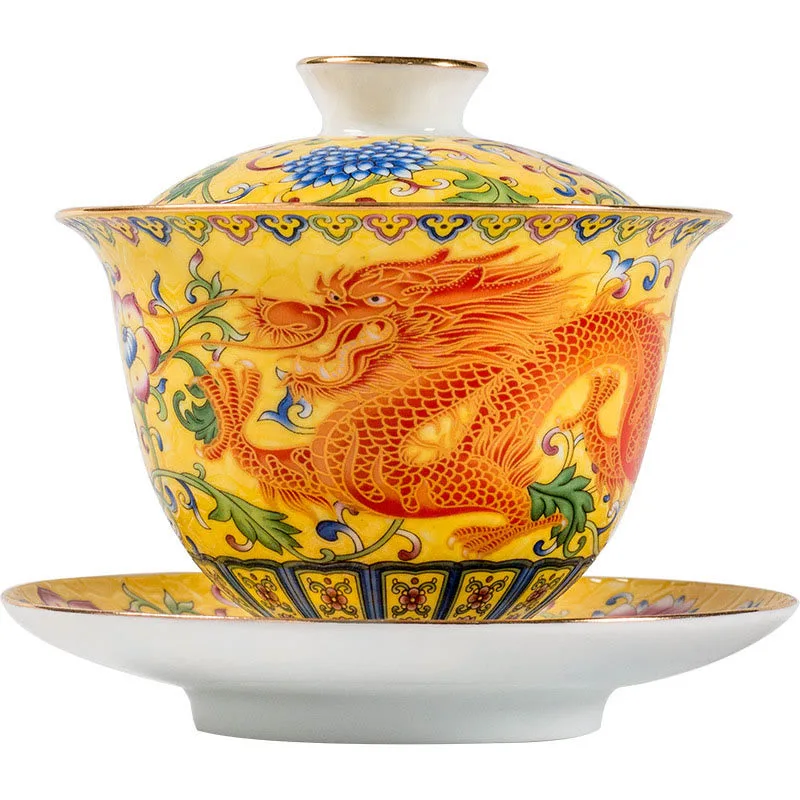 Dragon Phoenix Flower Design Ceramic Gaiwan Sancai Teacup Kung Fu Tea Cup And Saucer With Lid