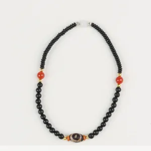 Dzi bead (Tib. ; pronounced “zee”; alternative spelling: gzi) is a type of stone bead of uncertain origin worn as part of a necklace and sometimes as a bracelet. Dzi beads are precious jewelry from Tibetan culture which is generally prized as protective amulets.these beads are believed to attract local protectors. dharmapalas or deities or maybe beneficial ghosts. ancestors or even bodhisattvas. Because of this. dzi beads are always treated with respect in Tibetan culture. Nine-Eye Dzi Bead is the symbol of The Nine Planets. It includes the activity of the Universe and the wisdom of the humanity. Nine-eyed beads is the most popular of all Dzis. brings all kinds of luck and blessings; protection. good health. purify negative energy expand intelligence and wisdom.It helps the investors with the successful development of new ideas in rolling in wealth.