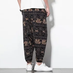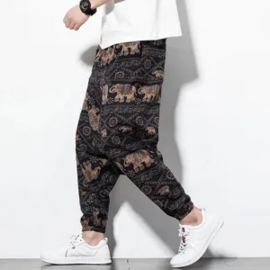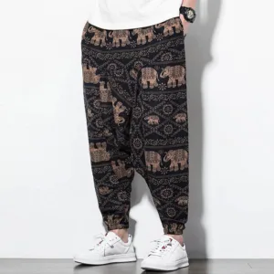 Elephant Print Cotton Harem Pants bring an earthy feel with their elephant-inspired brown and black design on soft cotton fabric. These long. cropped pants feature an adjustable waistband and deep pockets for practicality. creating a comfortable and grounded fit. Symbolizing strength and wisdom. the elephant print adds a meaningful touch to each step. supporting a calm and steady approach to daily activities.