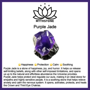 Purple Jade is a stone of happiness. joy. and humor. It helps us release self-limiting beliefs. along with other self-imposed limitations. and opens us up to the natural and effortless abundance the Universe provides.