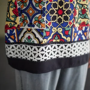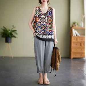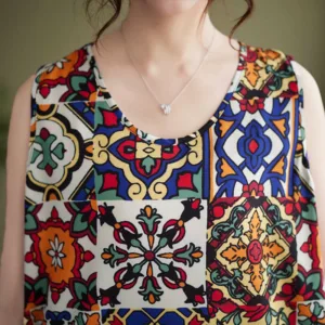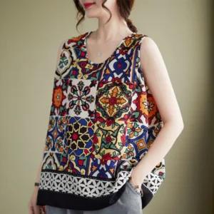 Ethnic Geometry Print tank top is a sleeveless. loose-fitting piece adorned with vibrant geometric patterns. The colorful designs symbolize diversity and the interconnectedness of different cultures. offering a reminder of the beauty in variety. The crew neck adds a touch of simplicity. making this tank top a celebration of unity and artistic expression.