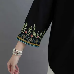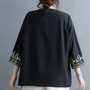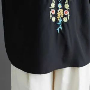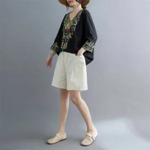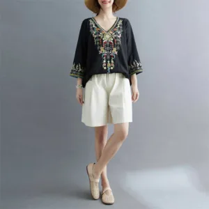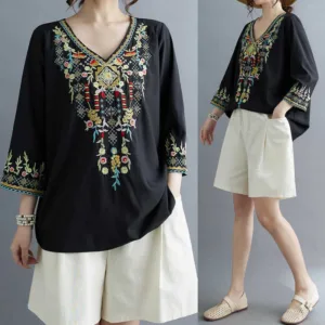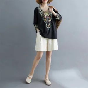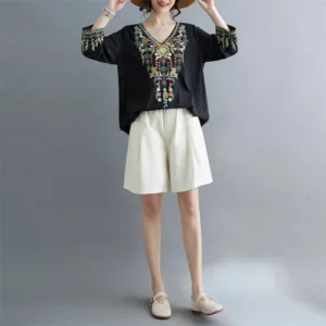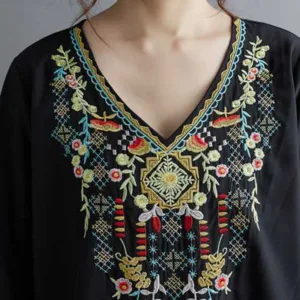 Ethnic Style Floral Cotton T-shirt features a large. V-shaped floral embroidery that beautifully spans the neckline. symbolizing cultural richness and deep connection. This three-quarter sleeve T-shirt. crafted from breathable fabric. offers a meaningful design that embodies the spirit of tradition and mindfulness. inviting a sense of grounded serenity into your day.