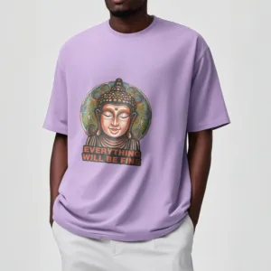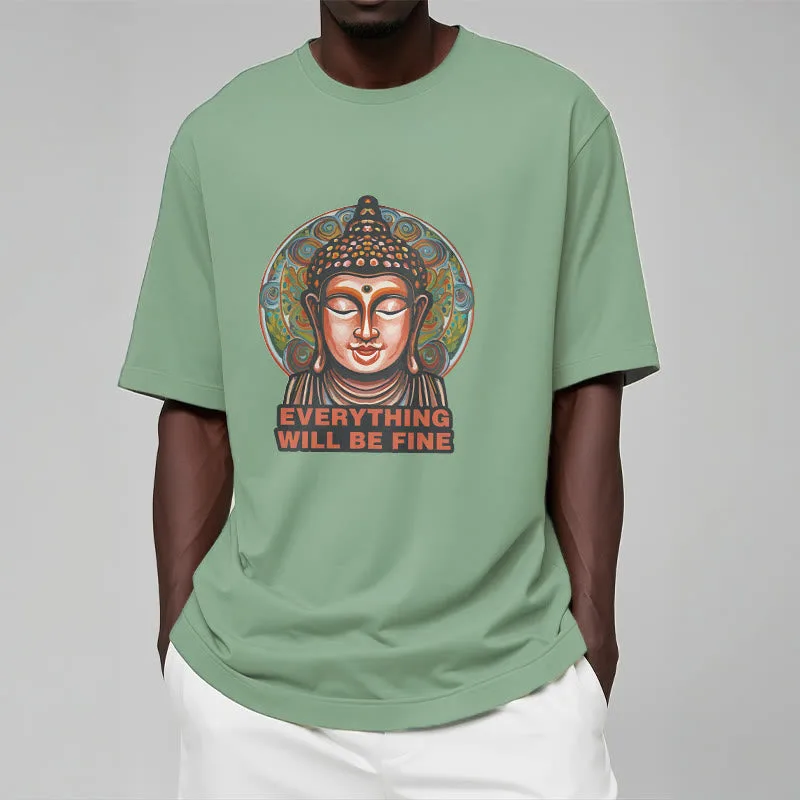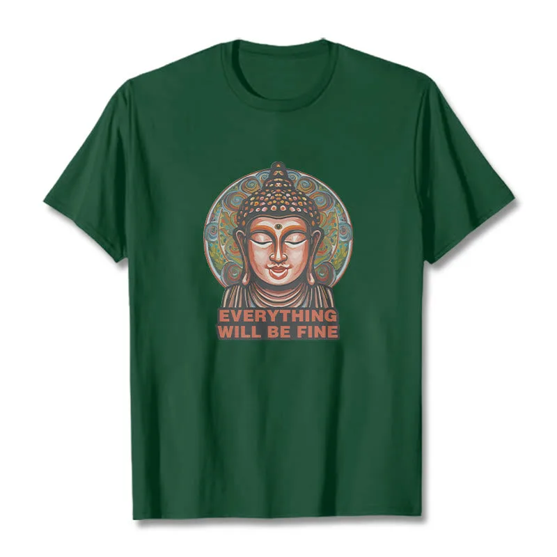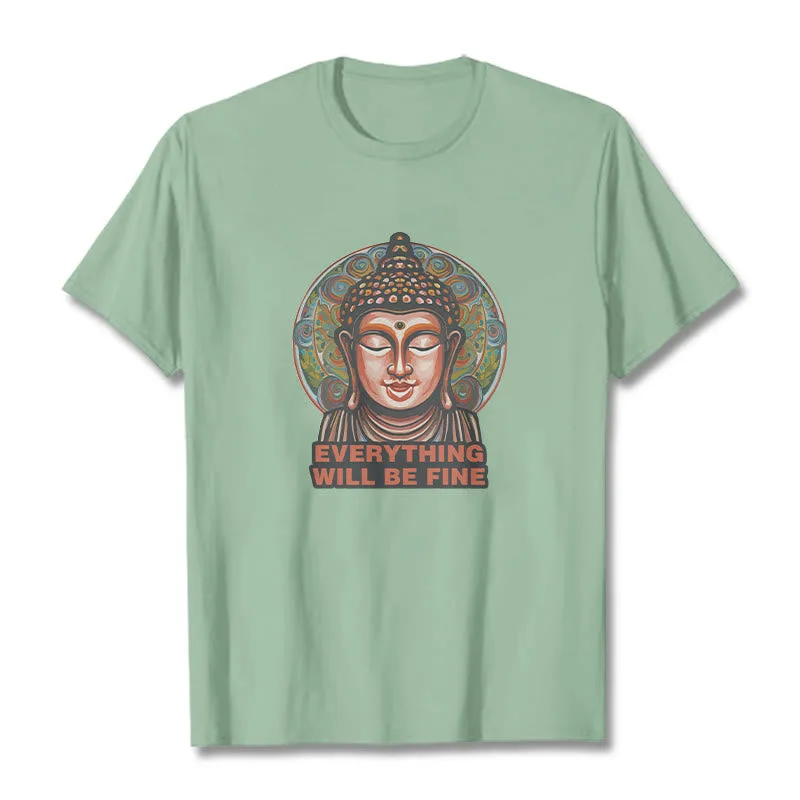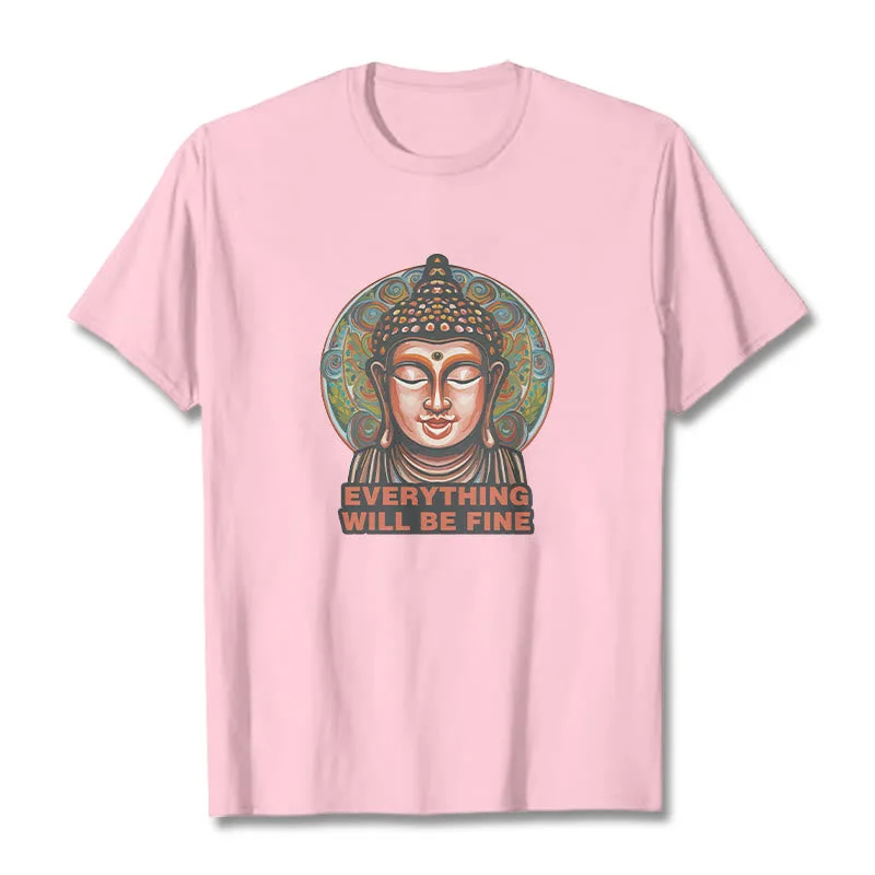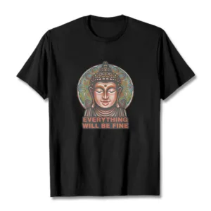 - DESIGN INSPIRATION: The T-shirt design features the phrase “EVERYTHING WILL BE FINE” alongside a Buddha statue. conveying a message of reassurance and tranquility. This combination emphasizes the idea of maintaining a positive outlook and inner peace amidst life’s challenges. reflecting the Buddhist philosophy of acceptance and mindfulness.