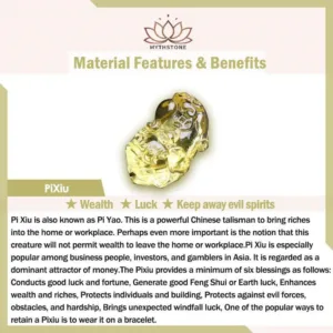 The Pixiu provides a minimum of six blessings as follows:Conducts good luck and fortune. Generate good Feng Shui or earth luck. Enhances wealth and riches. Protects individuals and building. Protects against evil forces. obstacles. and hardship. Brings unexpected windfall luck. One of the popular ways to retain a Pixiu is to wear it on a bracelet.