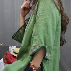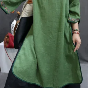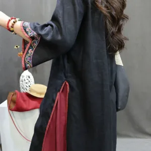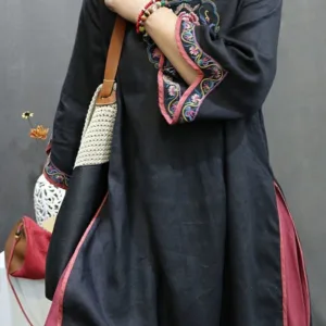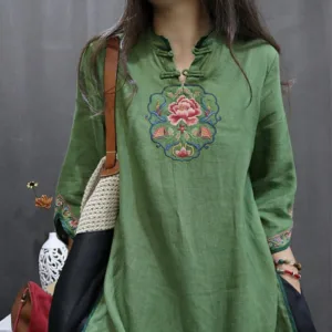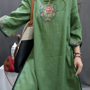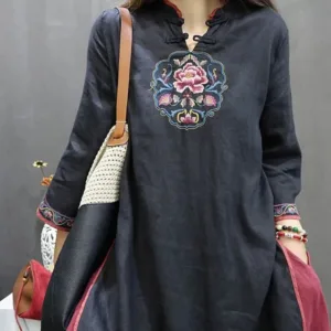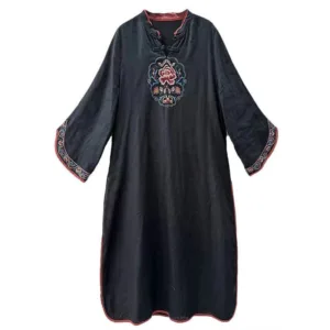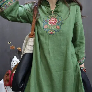 Flower Embroidery Cotton Midi Dress features intricate floral embroidery just below the stand collar. adding an elegant touch. Crafted from soft cotton. this dress includes traditional knot buttons. symbolizing unity and grace. The breathable fabric provides comfort. making it suitable for peaceful moments or gatherings. This dress merges cultural artistry with natural comfort. ideal for those seeking elegance and mindfulness in their wardrobe.