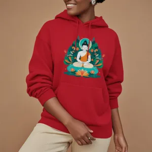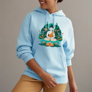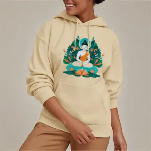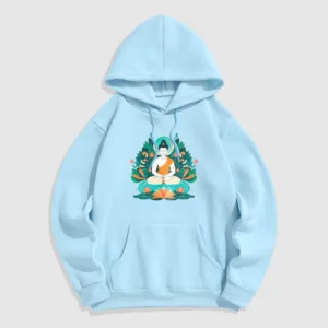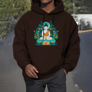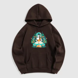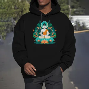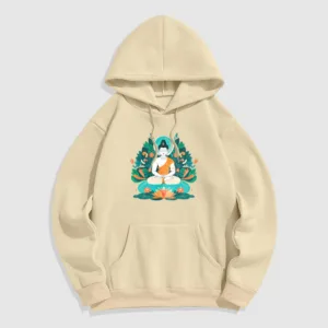 Flower Lotus Bodhisattva Polyester Hoodie showcases a peaceful Bodhisattva seated on a lotus. with symmetrical floral and grass designs in the background. symbolizing harmony and spiritual growth. Made from fleece-lined polyester. this hoodie offers warmth and comfort. perfect for meditation or reflective moments. The calming imagery and cozy fabric foster mindfulness. encouraging a grounded and balanced state of mind.