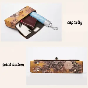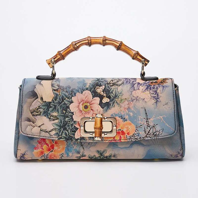 Flower Pattern Bamboo Handle bag features a stunning floral design. complemented by a bamboo handle and metal chain. This handbag combines natural materials with elegant craftsmanship. offering a unique and durable accessory. The floral pattern adds a touch of nature. while the bamboo handle ensures comfort. Perfect for those who appreciate eco-friendly and artistically crafted designs.