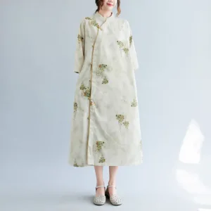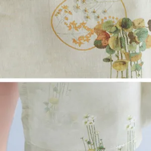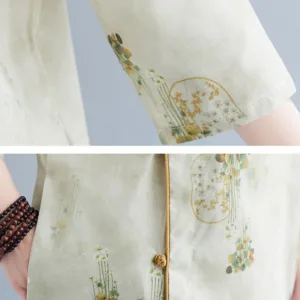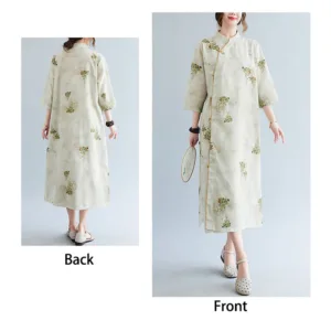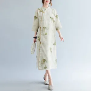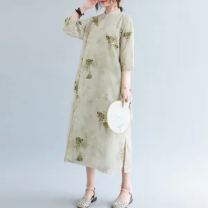 Flowers Green Yellow Leaves Print cheongsam features a beautiful floral pattern that symbolizes growth and vitality. This dress is designed with three-quarter sleeves and convenient pockets. making it perfect for meditation and spiritual practices. The elegant design and vibrant colors inspire a sense of peace and harmony. reflecting the natural beauty of flowers and leaves.