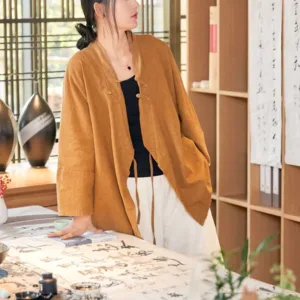 Frog-Button Hanfu coat features a traditional design with long sleeves and an open front. Ideal for Zen meditation. this top jacket offers a relaxed fit for maximum comfort. The frog-button closure adds a touch of elegance. while the breathable fabric ensures ease of movement. Perfect for mindfulness practices. this coat promotes a calm and centered mindset.