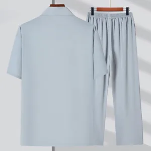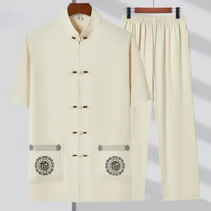Fu Character Embroidery set features a traditional Tang suit design with frog-button closure. short sleeves. and matching pants. The top is adorned with detailed Fu character embroidery. symbolizing good fortune and prosperity. Crafted from high-quality fabric. this men’s set offers a blend of cultural heritage and comfort. perfect for special occasions or everyday wear.