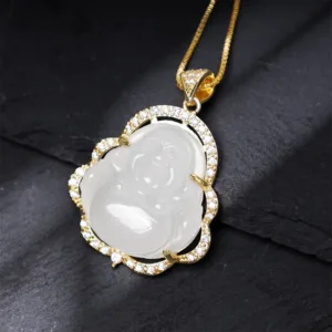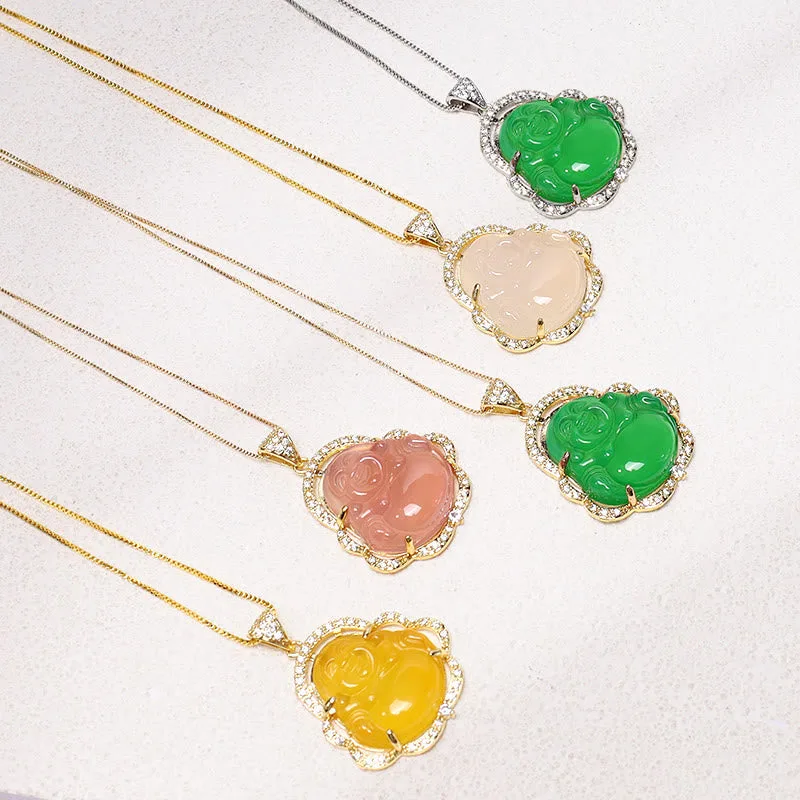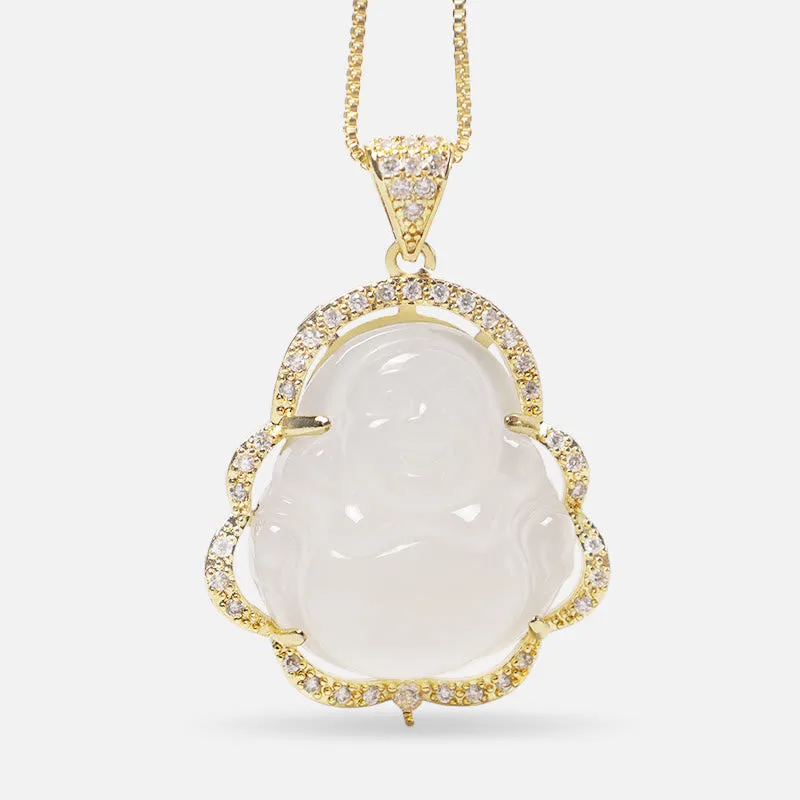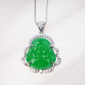 Good Luck Laughing Buddha Necklaceis designed to bring you a sense of calm no matter the situation of things. A laughing Buddha is always a sign of good luck. Sheng Fui. windfall luck. and happiness. With a combination of jade stones. this necklace is sure to bring good fortune your way. The jade also brings you the strength to do well in your finances.