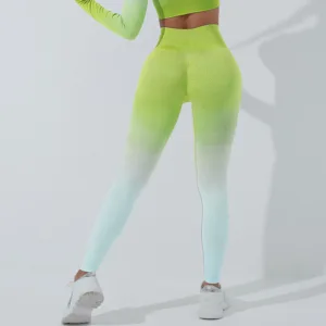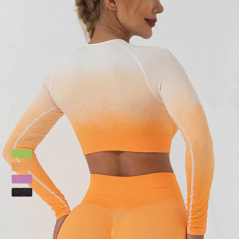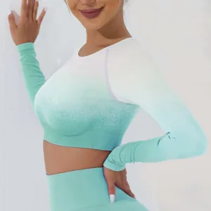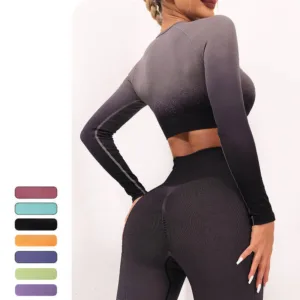 Gradient Long Sleeve Yoga outfit is designed for yoga and fitness enthusiasts. This set includes a crop top tee. bra. and leggings. all crafted from breathable fabric to ensure comfort during workouts. The gradient design adds a touch of serenity. while the fitted silhouette supports movement and flexibility.Embrace the balance and tranquility this outfit brings to your practice.