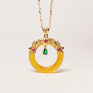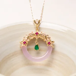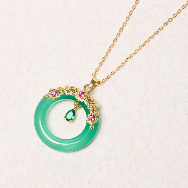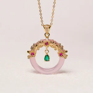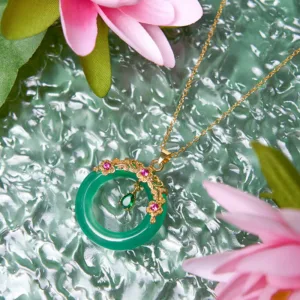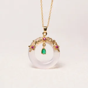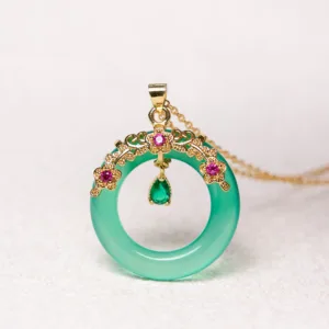 Green Chalcedony Peace Buckle pendant features a design symbolizing strength and tranquility. The green chalcedony is known for its calming properties and ability to foster inner peace. This pendant is crafted to promote emotional balance and resilience. making it a meaningful accessory for those seeking to enhance their spiritual well-being and maintain a sense of calm and strength.