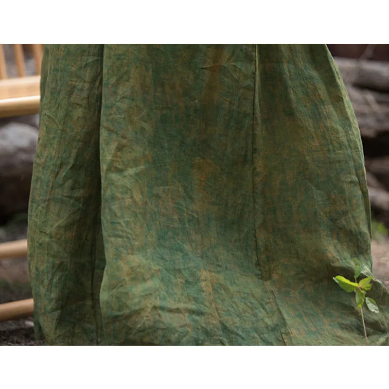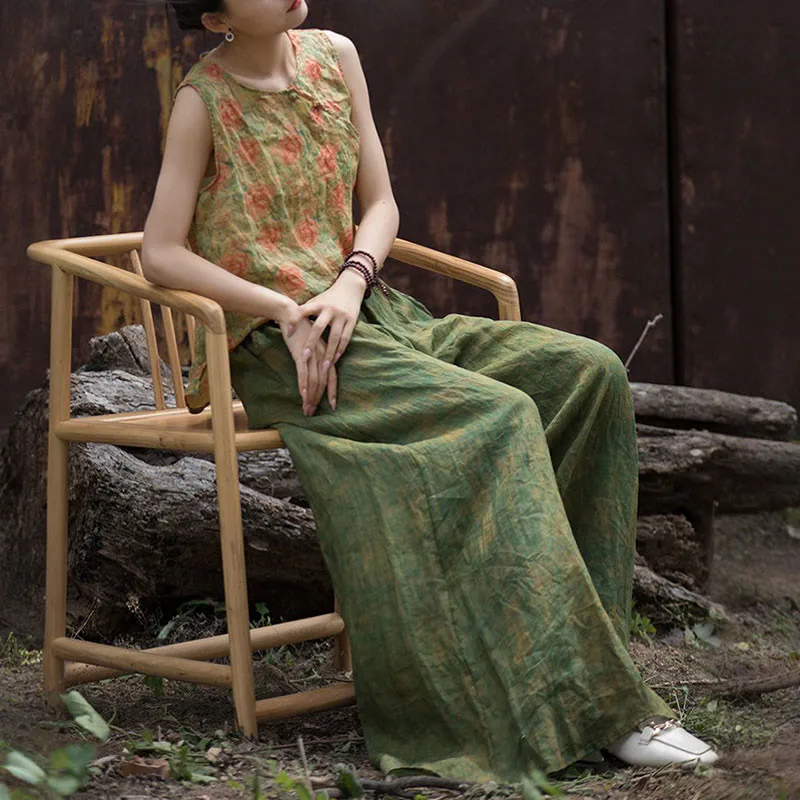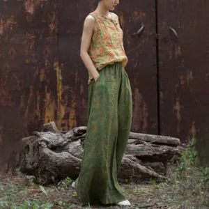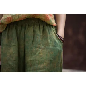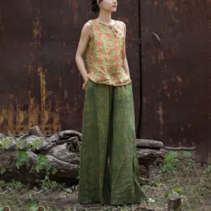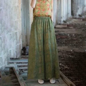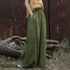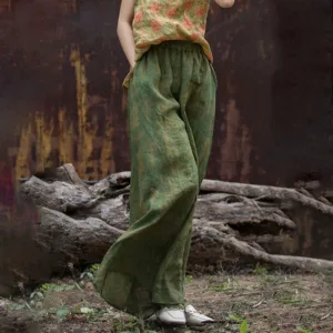 Green Yellow Ramie Linen pants feature a flexible waistband and wide-leg design. complete with practical pockets. These pants are crafted from breathable ramie linen. providing comfort and ease of movement. The green and yellow hues symbolize growth and energy. while the loose fit represents relaxation. Perfect for promoting a sense of tranquility and well-being. these pants blend functionality and comfort seamlessly.