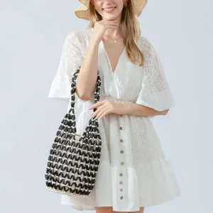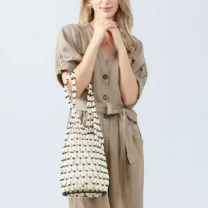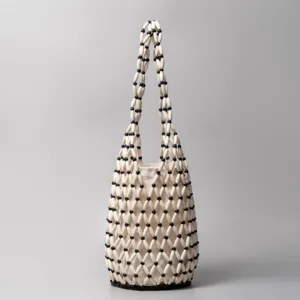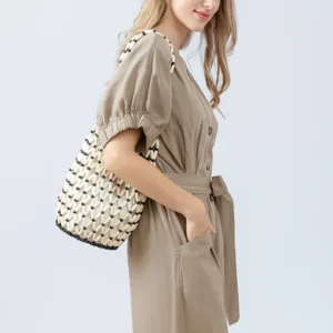 Hand-woven Wooden Beads Bucket Shoulder bag features a unique bucket design crafted from natural wooden beads. This versatile handbag showcases intricate weaving. combining durability with bohemian style. The spacious interior and sturdy handle make it perfect for daily use and special occasions. This shoulder bag adds a touch of elegance to any outfit.