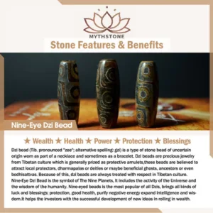 Dzi bead (Tib. ; pronounced “zee”; alternative spelling: gzi) is a type of stone bead of uncertain origin worn as part of a necklace and sometimes as a bracelet. Dzi beads are precious jewelry from Tibetan culture which is generally prized as protective amulets.these beads are believed to attract local protectors. dharmapalas or deities or maybe beneficial ghosts. ancestors or even bodhisattvas. Because of this. dzi beads are always treated with respect in Tibetan culture. Nine-Eye Dzi Bead is the symbol of The Nine Planets. It includes the activity of the Universe and the wisdom of the humanity. Nine-eyed beads is the most popular of all Dzis. brings all kinds of luck and blessings; protection. good health. purify negative energy expand intelligence and wisdom.It helps the investors with the successful development of new ideas in rolling in wealth.