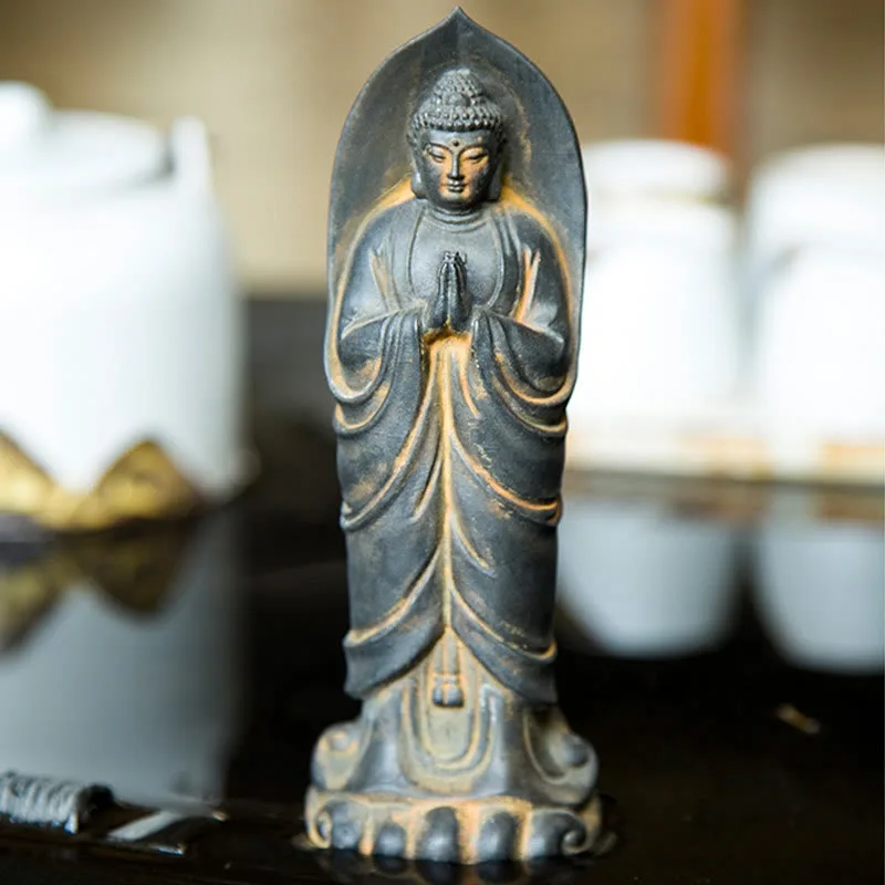 Handmade Sakyamuni Namaste statue embodies peace and reverence. Crafted from iron powder rust cast resin. this statue depicts Sakyamuni Buddha in a namaste pose. symbolizing respect and humility. Ideal for home or meditation spaces. it serves as a powerful reminder of spiritual devotion and inner peace. This statue adds a touch of tranquility and mindfulness to any environment.