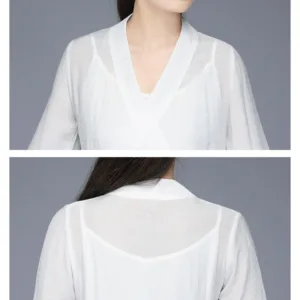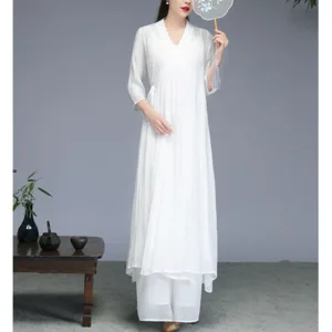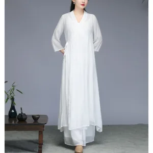 Hanfu Style Midi dress features a traditional design with wide leg pants. perfect for meditation. Zen practice. yoga. and dance. Crafted for comfort and ease of movement. this clothing set promotes a serene and balanced mindset. The flowing fabric and loose fit ensure you stay comfortable during your practice. enhancing your overall sense of tranquility.