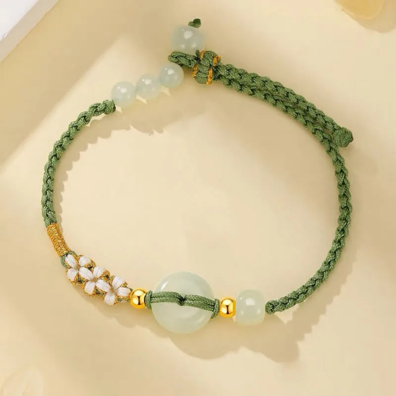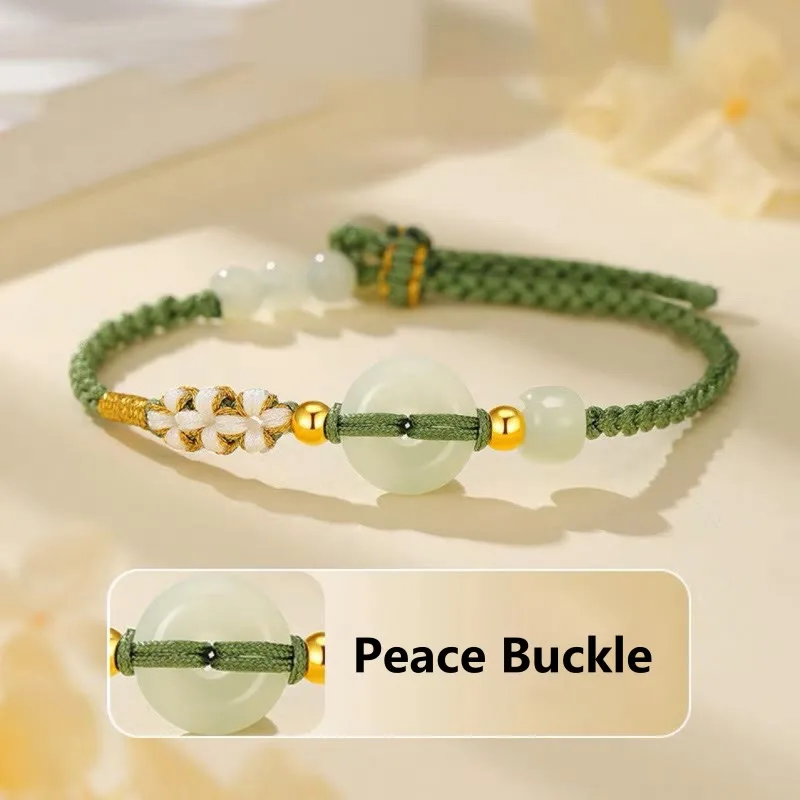 Mythstone Hetian Jade Peace Buckle Luck Peach Blossom Braided Bracelet