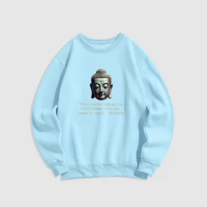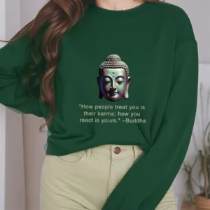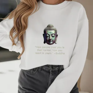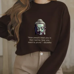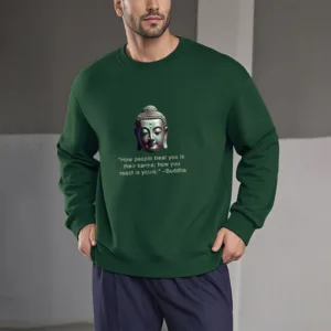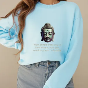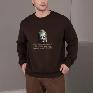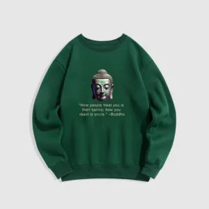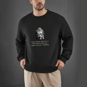 Buddha Message Polyester Sweatshirt displays a serene Buddha face with the phrase ??How People Treat You Is Their Karma??beneath. Crafted from fleece-lined polyester. this sweatshirt offers warmth and a reminder of the power of karma and inner peace. The meaningful design encourages reflection on one’s actions and mindset. making it an ideal choice for those embracing mindfulness.