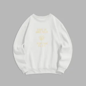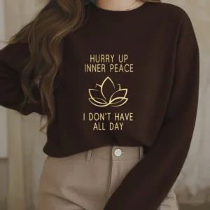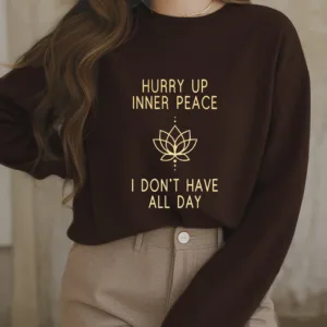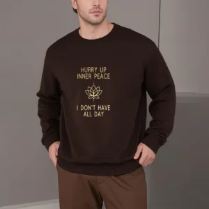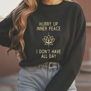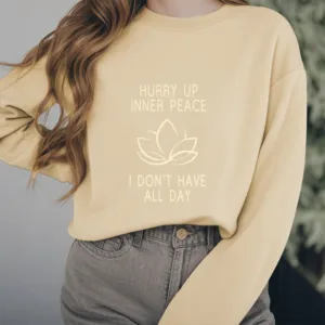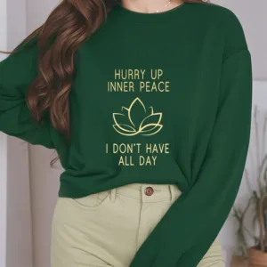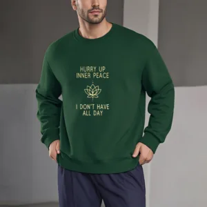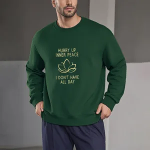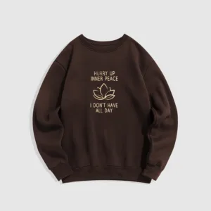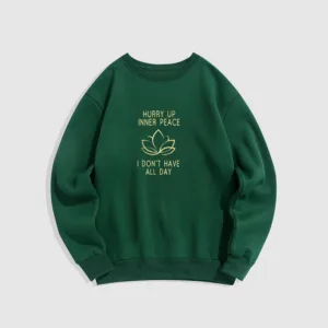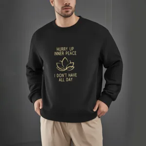 Hurry Up Inner Peace Round Neck Sweatshirt features a minimalist lotus flower design centered between motivational text. symbolizing tranquility and mindfulness. Made from fleece-lined material. this round neck sweatshirt offers warmth and comfort. ideal for moments of relaxation or meditation. The soft. breathable fabric provides a cozy fit. inviting you to embrace peace and calm throughout your day.
