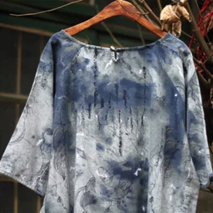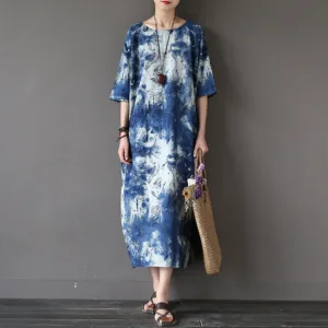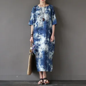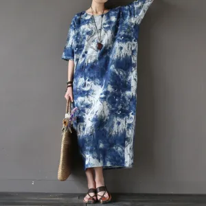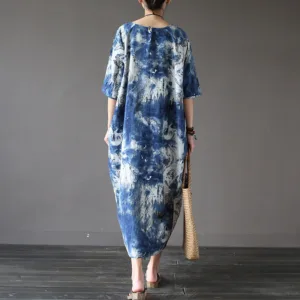 Ink Tie Dye Midi dress blends artistic flair with comfort. featuring a unique ink tie-dye pattern on a soft cotton linen blend. This three-quarter sleeve dress includes practical pockets for added convenience. Perfect for those who appreciate distinctive designs and functional style. it offers a relaxed fit and a touch of elegance. making it ideal for any occasion.