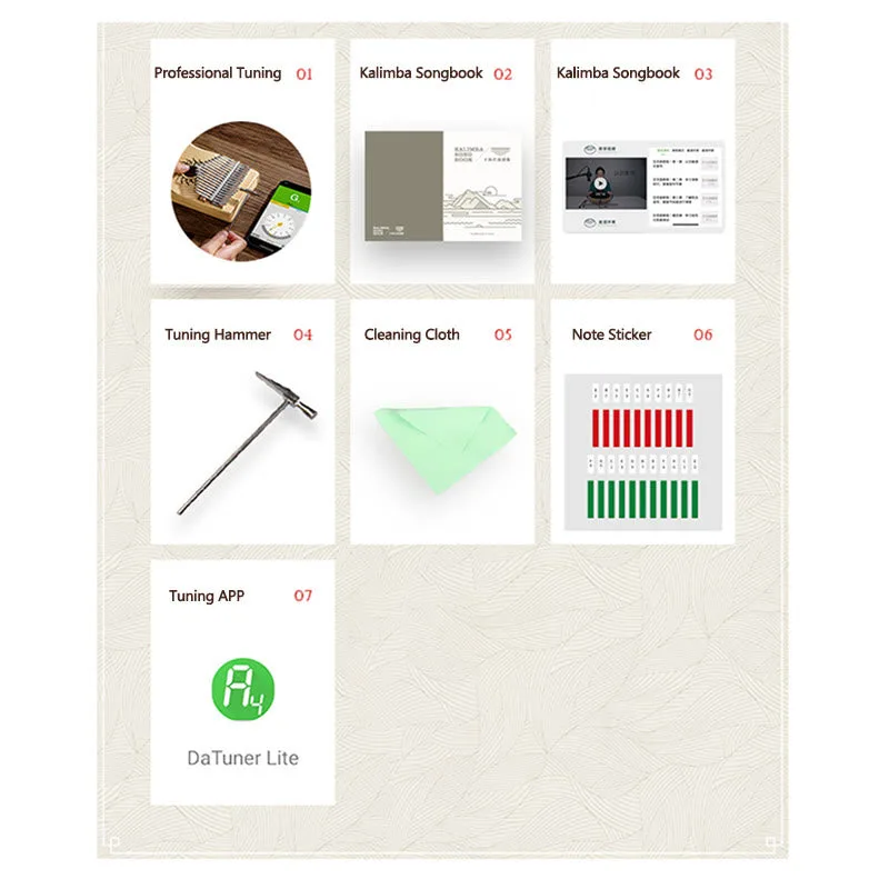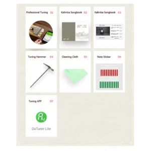 - Package Included: Kalimba*1. Kalimba Songbook*1. Tuning Hammer*1. Note Sticker*1. Cleaning Cloth*1