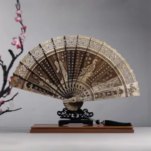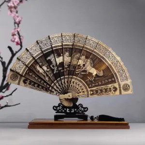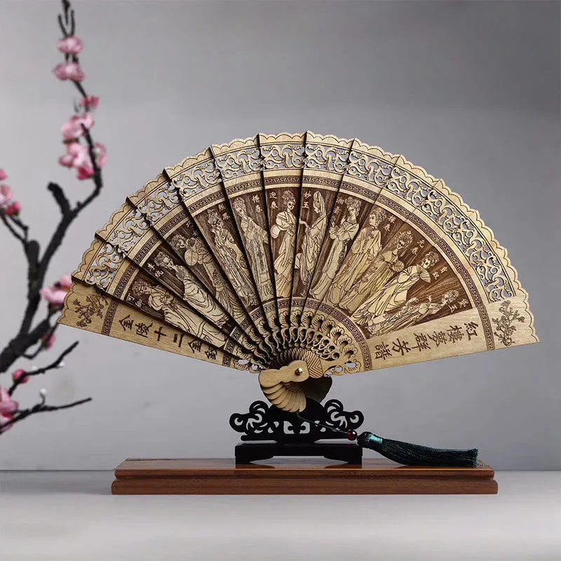 Zhennan Wood Engraved folding fan is crafted entirely from Phoebe Zhennan wood. featuring a delicate hollow floral pattern at the top and a beautifully carved Koi Fish in the center. This fan symbolizes prosperity. perseverance. and good fortune. with the Koi Fish representing strength in the face of adversity. Ideal for reflection and serenity.